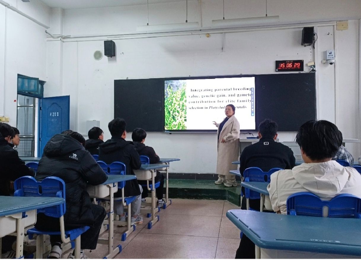 11月06日下午15时,化学与环境工程学院焦思倩博士在4201教室举办学术讲座,报告题目为《Integrating parental breeding value, genetic gain, and gamete contribution for elite family selection in Platycladus orientalis》,我院环境生态工程专业学生聆听了报告。焦思倩博士围绕侧柏种子园的遗传改良与优良家系筛选,从研究背景、关键技术、成果应用等多个维度展开系统讲解。她指出,种子园作为林木良种选育的核心平台,在提升木材产量、改善干形质量、保存稀有基因等方面具有不可替代的作用。但也面临亲本配置不优、配子贡献失衡及遗传多样性维持等挑战。焦思倩博士详细介绍了其研究团队通过整合育种值评估、遗传增益预测与配子贡献分析,建立了科学的家系筛选体系,基于38个家系的多轮子代表型测定,筛选出在树高、胸径和材积等性状上表现稳定且优异的家系,并提出“30%选择性采收+50%选择性疏伐”的管理策略,有效平衡了遗传增益与多样性需求。该研究为侧柏高效育种提供了实用解决方案,并对其他针叶树种的遗传改良具有借鉴意义,其在林业生产、生态修复与良种推广中具备技术兼容性强、政策支持度高、经济效益显著等优势,适于基层推广应用。