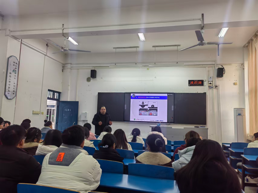 11月27日,化学与环境工程学院周延彪博士在4104教室举办学术讲座,报告以“超润湿多孔材料的设计与应用”为题,我院化学和材料专业学生到场聆听。