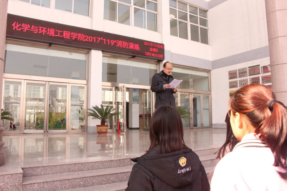 | 11月24日中午,化学与环境工程学院在化学楼前开展“119”消防演练活动。叶露阳老师及部分学生干部担任安全疏散负责人。17级同学参加此次演练。
