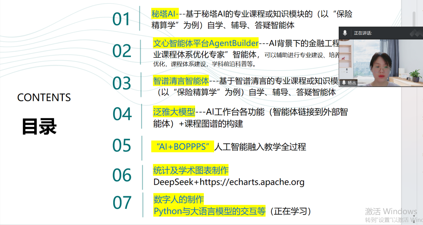 杨丛老师则以《人工智能赋能高等教育应用场景案例汇总》为主题,从四大方面进行了汇报,主要包括:1.分享秘塔、文心智能体、智谱清言等AI平台在课程智能体构建中的应用实践;2.介绍并演示了超星学习通泛雅大模型新增的AI工作台、任务引擎和课程图谱的主要功能;3.探讨AI与BOPPPS教学法融合的课程改革路径,并演示了学习通数据与DeepSeek相结合的教学分析案例;4.分享数据可视化(通过专业图表网站)、数字人制作技术以及Python与大语言模型交互等方面的教学应用探索。