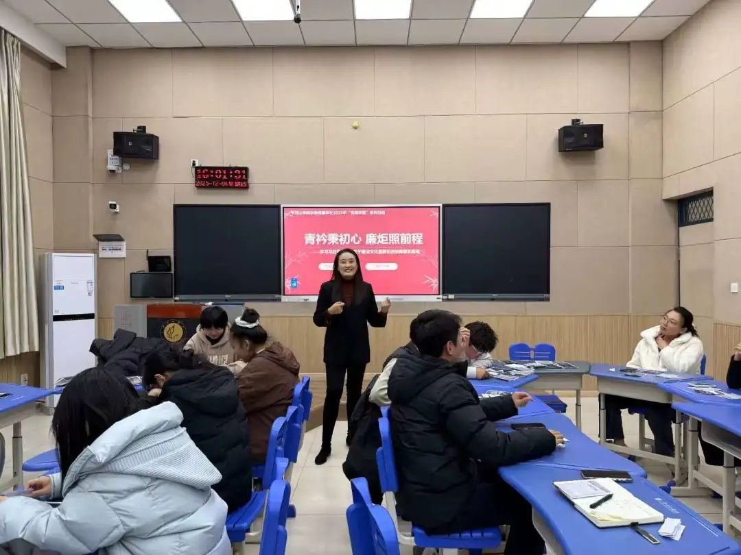 石培琳以《知廉倡廉,行稳致远 —— 践行习近平总书记关于廉洁文化重要论述的青春行动》为题,围绕“知廉、信廉、行廉、倡廉”四个方面,结合学生所学专业和职业发展趋势,系统解读行业廉洁从业规范与职业伦理要求。她通过互动研讨、情景分析等形式,引导学生深刻认识到青年在廉洁文化宣传中的责任担当,鼓励学生不仅要严守个人廉洁底线,更要主动传播清风正气,通过参与廉洁文化活动、分享廉洁理念等方式,带动身边人共同营造“以廉为美、以贪为耻”的氛围,推动廉洁文化在校园落地生根、蔚然成风。